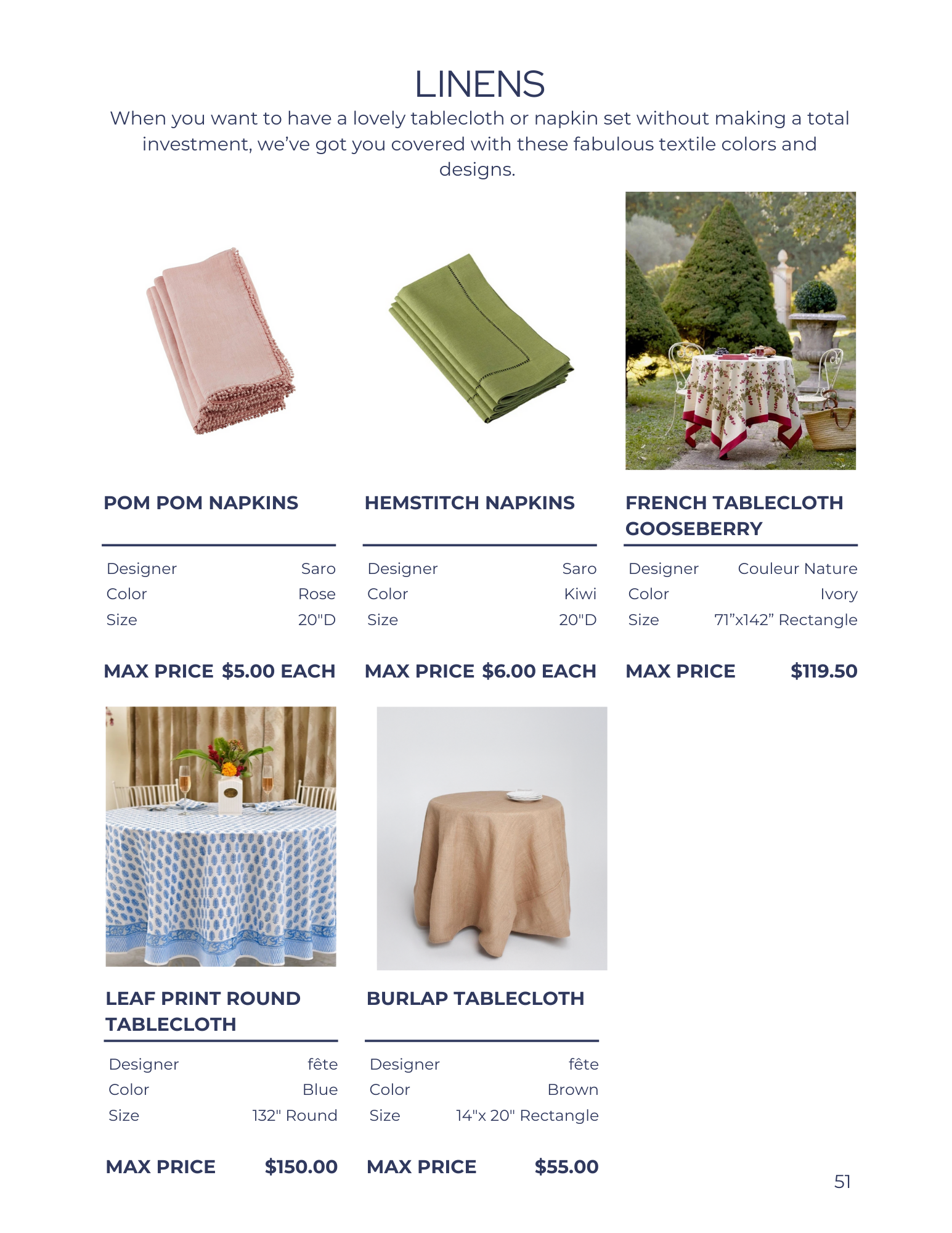 Browse our rental selection by category to make the perfect setting. For more details or to get your rental order started, contact us rentals@tresbellefete.com